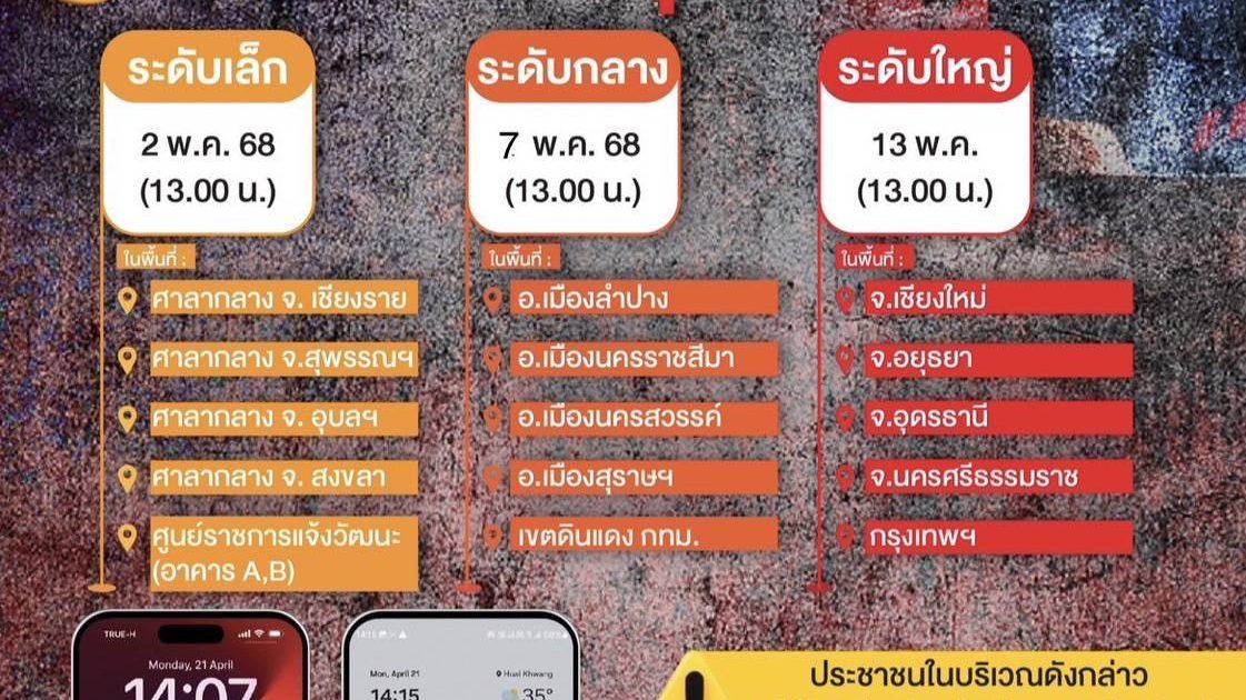 🔴 วันอังคารที่ 13 พ.ค. 68 เวลา 13.00 น. ระดับใหญ่ (ระดับจังหวัด) ใน 5 พื้นที่ ประกอบด้วย จ.เชียงใหม่ จ.อุดรธานี จ.พระนครศรีอยุธยา จ.นครศรีธรรมราช และกรุงเทพมหานคร